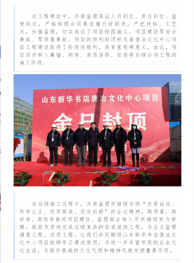 我公司監(jiān)理的山東新華書店唐冶文化中心項目順利封頂