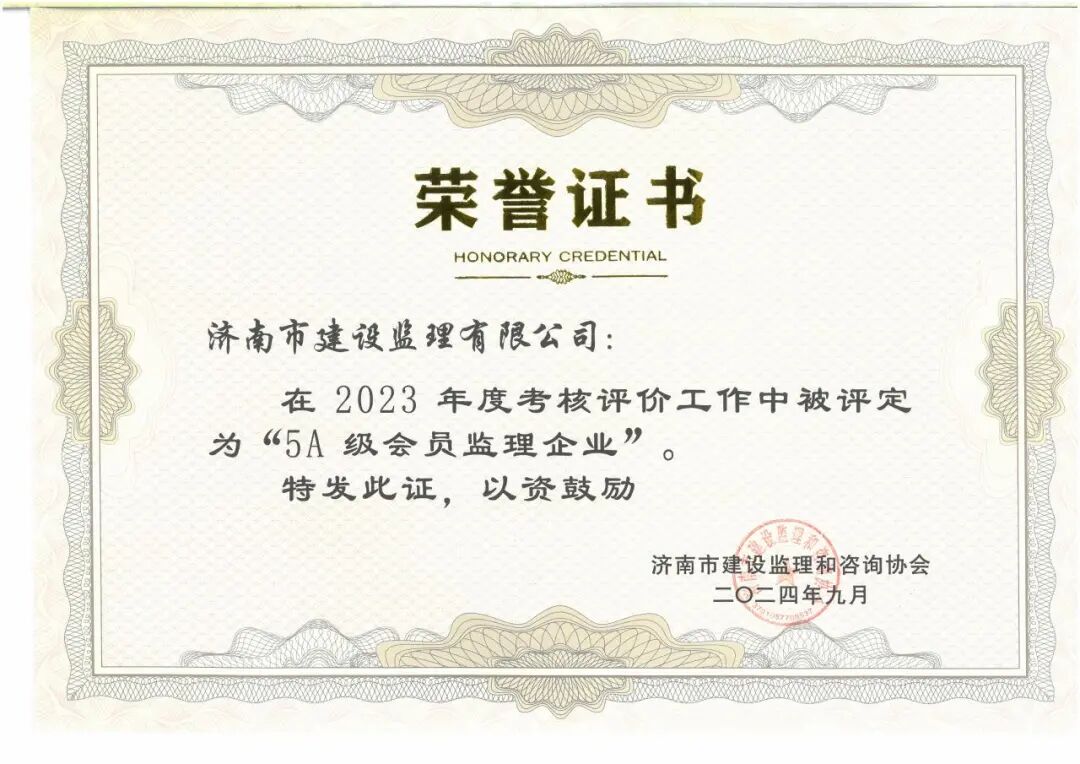 濟南市建設監(jiān)理和咨詢協(xié)會公布了2023年度監(jiān)理企業(yè)和從業(yè)人員考核評價結果,濟南監(jiān)理榮獲“2023年度5A級會員監(jiān)理企業(yè)”,陳志翔等17名同志分別榮獲“5A級總監(jiān)理工程師”、“5A級專業(yè)監(jiān)理工程師”和“5A級監(jiān)理員”。