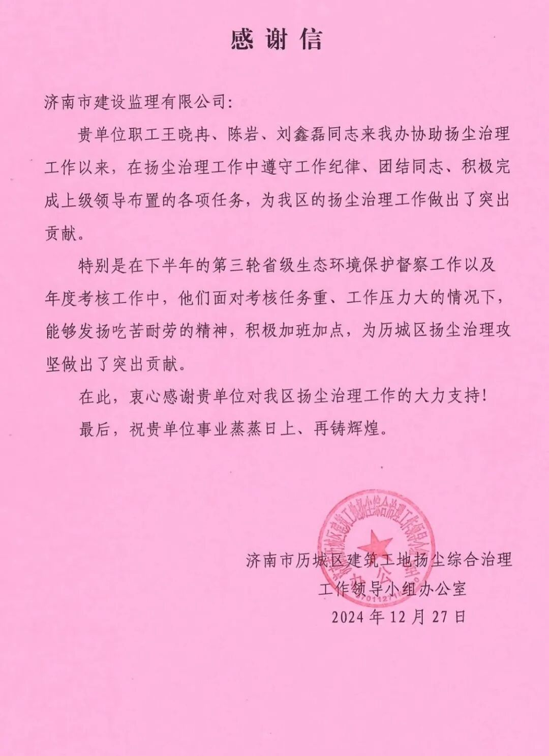 近日,我公司歷城區(qū)住建局第三方巡檢項(xiàng)目收到了來(lái)自歷城區(qū)建筑工地?fù)P塵綜合治理工作領(lǐng)導(dǎo)小組辦公室表?yè)P(yáng)信,信中對(duì)我公司項(xiàng)目工作人員的業(yè)務(wù)水平、責(zé)任心、組織協(xié)調(diào)能力給予充分肯定。
